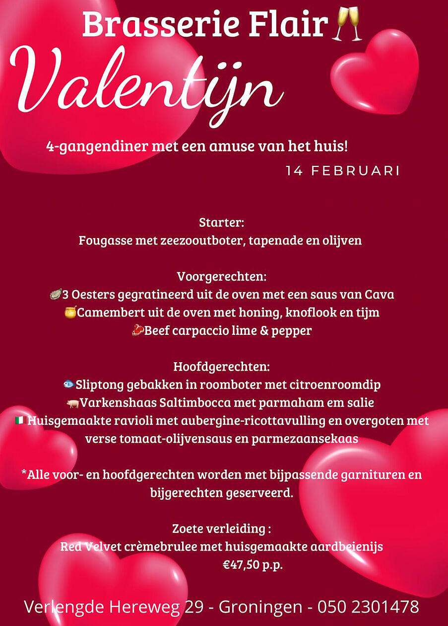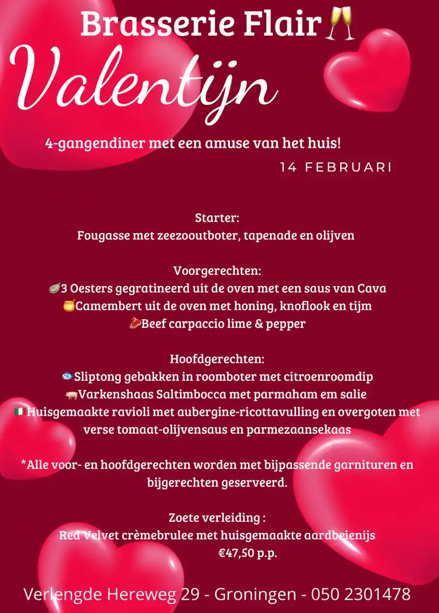 13 en 14 februari vieren we de liefde bij Flair met een heerlijk 4-gangenmenu met amuse van het huis voor 47,50 per persoon! Reserveer alvast uw plekje en geniet van een heerlijke bourgondische avond!