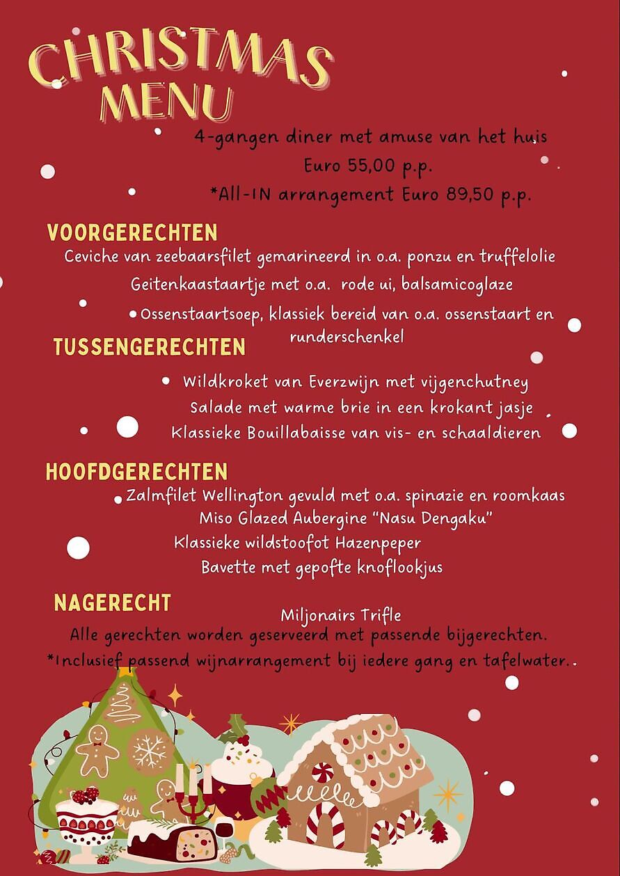 We hebben weer een prachtig menu samengesteld voor deze Kerst! Reserveer alvast uw tafel voor woensdag Kerstavond of donderdag 1e kerstdag.